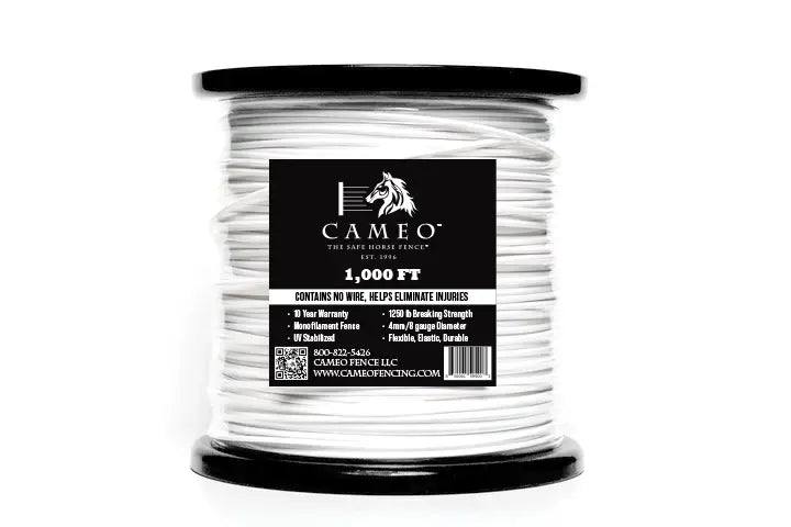 Cameo fencing is a metal-free white-line monofilament of nylon-based UV-stabilized polymer designed specifically for horse fencing. At 4mm in diameter (approximately 1/8"), Cameo fencing is strong, durable, yet flexible, ensuring your horse's safety. Cameo fencing was engineered to be the safest horse fence on the market and has been officially dubbed “The Safe Horse Fence.” Although Cameo has a breaking strength of 1200 lbs, its safety comes from its metal-free flexibility and elasticity. Should your horse find itself wrapped up in Cameo, its flexibility gives your horse the ability to free itself and do it injury-free! The elasticity ensures that your Cameo fence will conform to its original position. Not only is Cameo “The Safe Horse Fence,” but it also provides an aesthetically pleasing fence line and adds value to any property. It is one of the most affordable horse fence options on the market, so do not be fooled by other “like Cameo” options or imitators; there is only one Cameo horse fencing system.